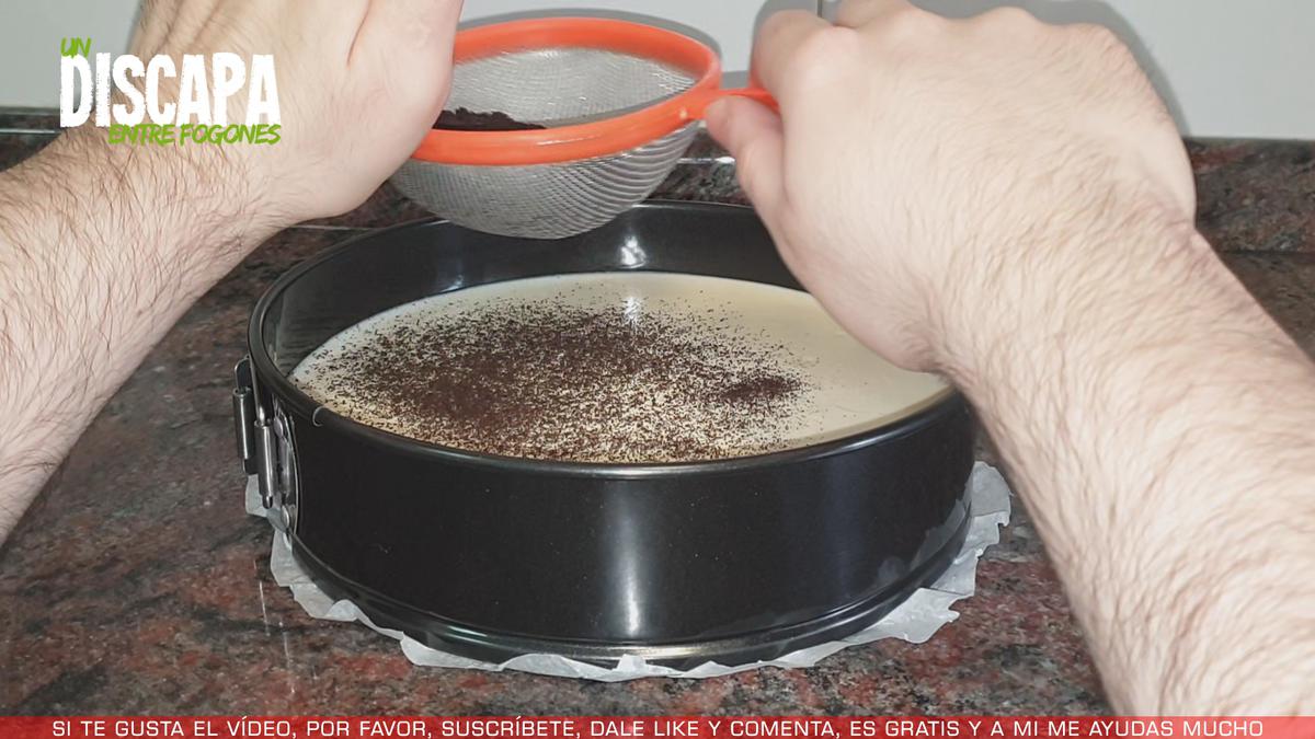10Cuando ya tenemos la tarta bien fría con la ayuda de un colador espolvoreamos la galleta triturada por encima.