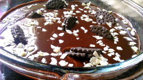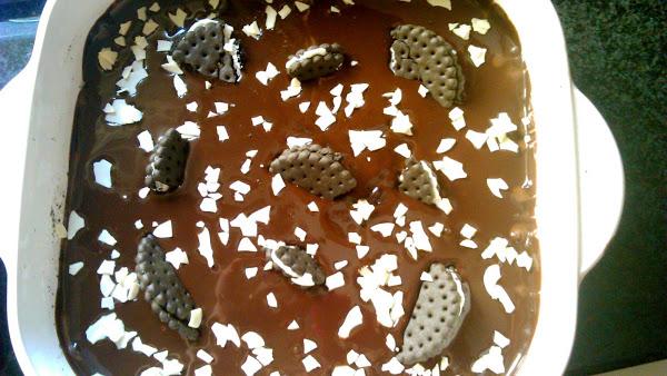Decoramos con trozos de galleta Oreo y chips de chocolate. Llevamos al frigorífico un par de horas, como mínimo.