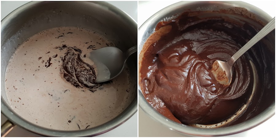13. - Ponemos la nata (crema de leche) a calentar en un cazo y cuando empiece a hervir, apartamos y le añadimos el chocolate troceado, tapamos y dejamos 5 minutos.