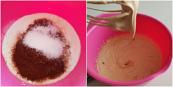 8. - Pasamos al relleno, tan fácil como poner la nata (crema de leche) muy fría con el café soluble y el azúcar y batir , si es con varillas eléctricas, mejor, hasta que monte.