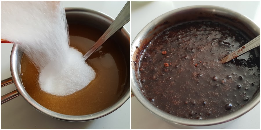 2. - Le añadimos el azúcar y el cacao y mezclamos bien.