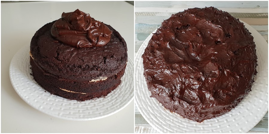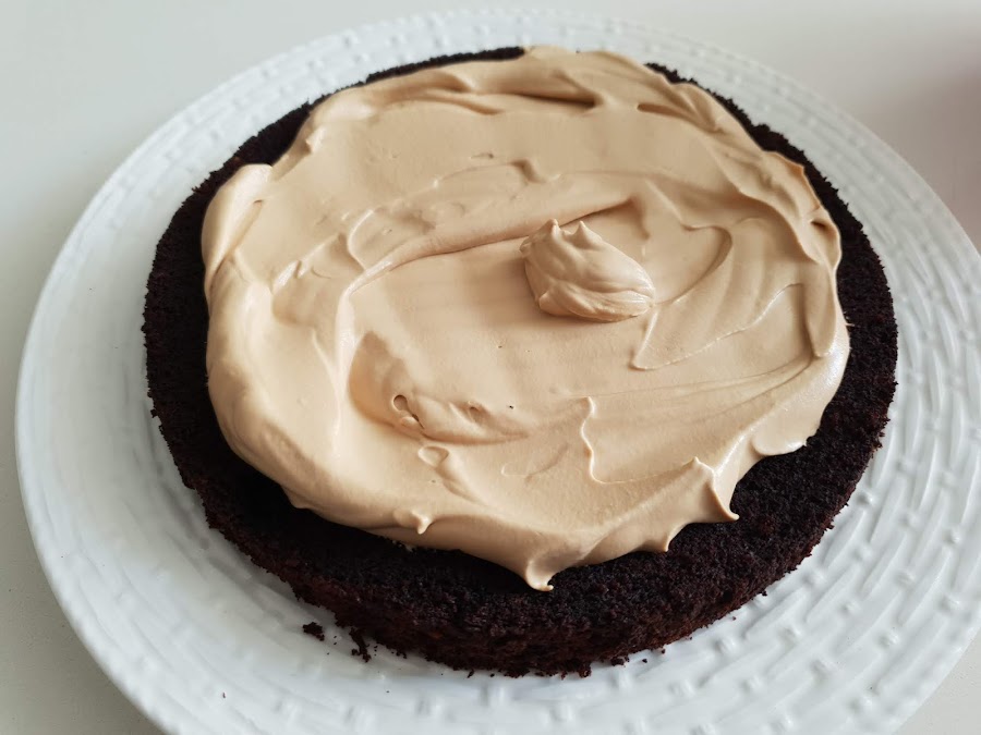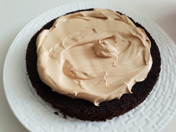 Con respecto al relleno, me he decidido a ponerle una crema de café o moka, porque la combinación de sabores, para mi gusto, es perfecta, así como la cobertura de chocolate negro, para que no resulte una tarta demasiado "empalagosa".