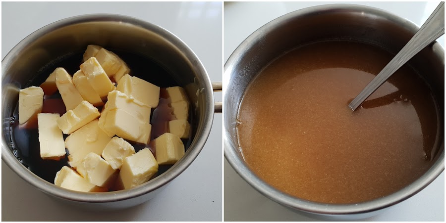 1. - Comenzamos encendiendo el horno a 180º. Y ponemos en un cazo el vino junto con la mantequilla al fuego hasta que la mantequilla se disuelva totalmente.