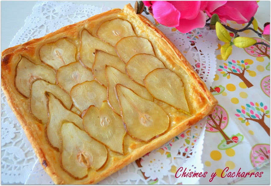 Hace tiempo fuimos a cenar a un restaurante y nos pusieron de postre una tarta parecida a esta que os traigo hoy, es tan, tan fácil que no podía dejar de ponerla aquí. Se hace en un pis-pas y además está muy buena. Incluso se pude dejar preparada y mientras se está comiendo meterla en el horno para poder comerla caliente, que así gana mucho el hojaldre.