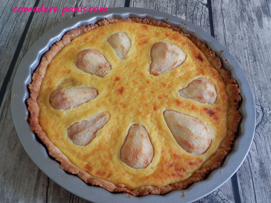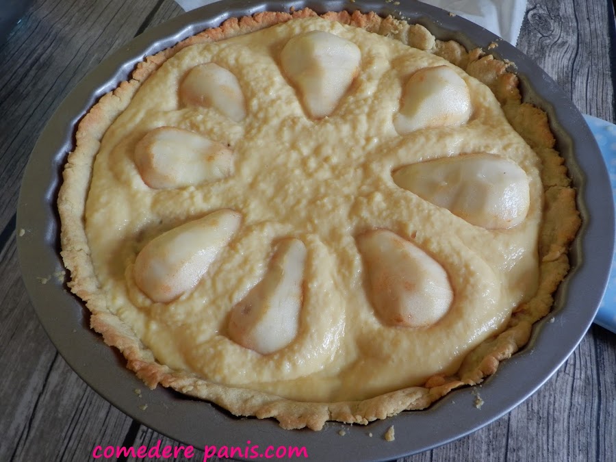 Ahora monta la tarta, vierte las natillas sobre la base de la tarta y coloca las peras en intervalos regulares.