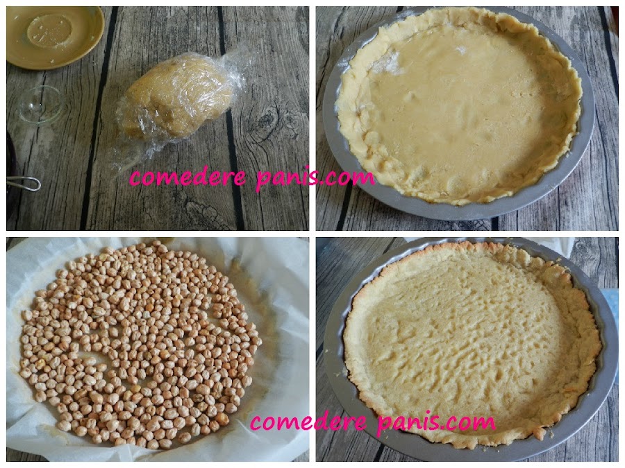 Saca la masa de la nevera, y sobre el film estírala con un rodillo espolvoreando la masa con harina para evitar que se pegue al rodillo, luego forra el molde con la masa, aquí verás que con ayuda del film es más fácil darle la vuelta, retira el film y coloca un papel de horno sobre la masa.