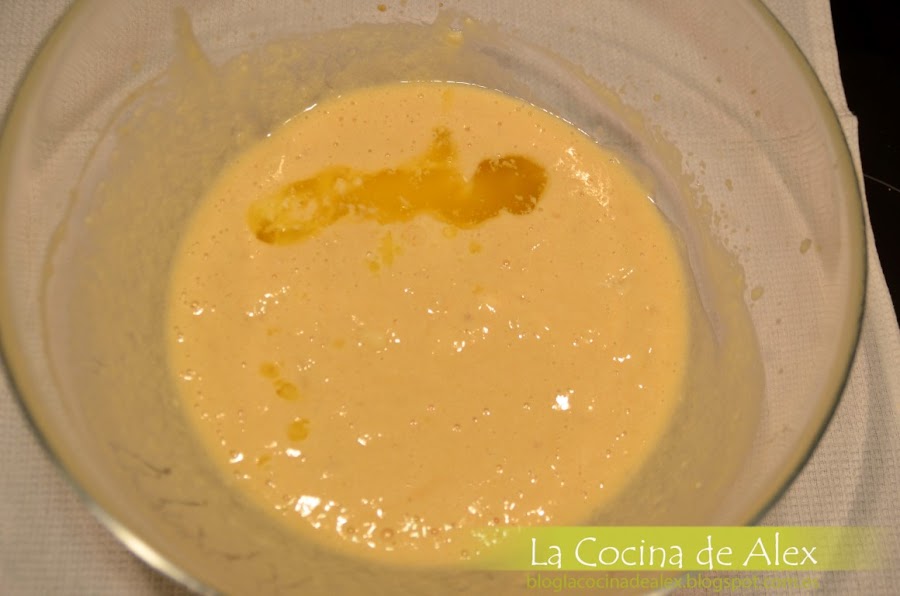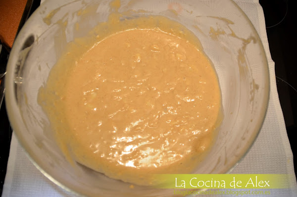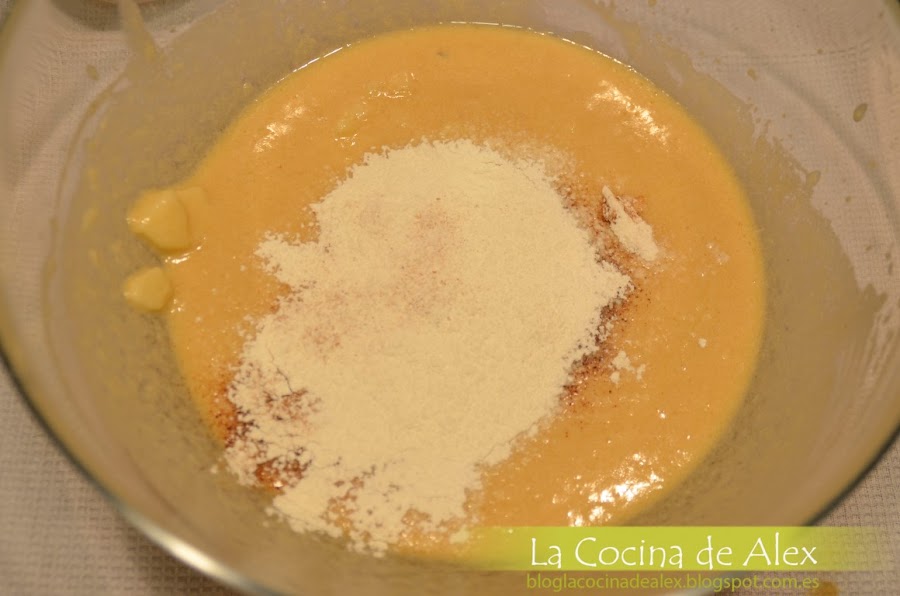 Una vez que tenemos la mantequilla templada la incorporamos a la mezcla anterior. También vamos a precalentar el horno a 190º para que vaya cogiendo temperatura.