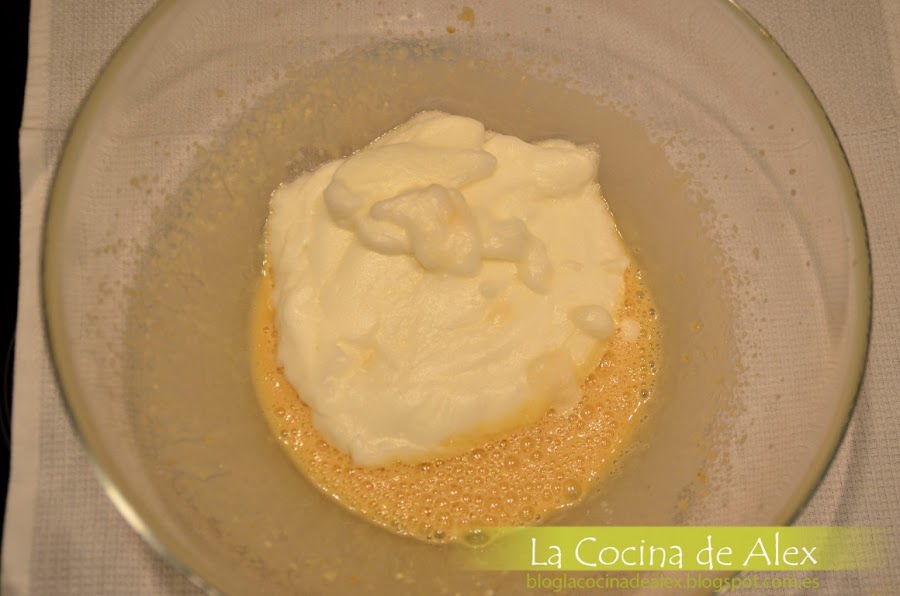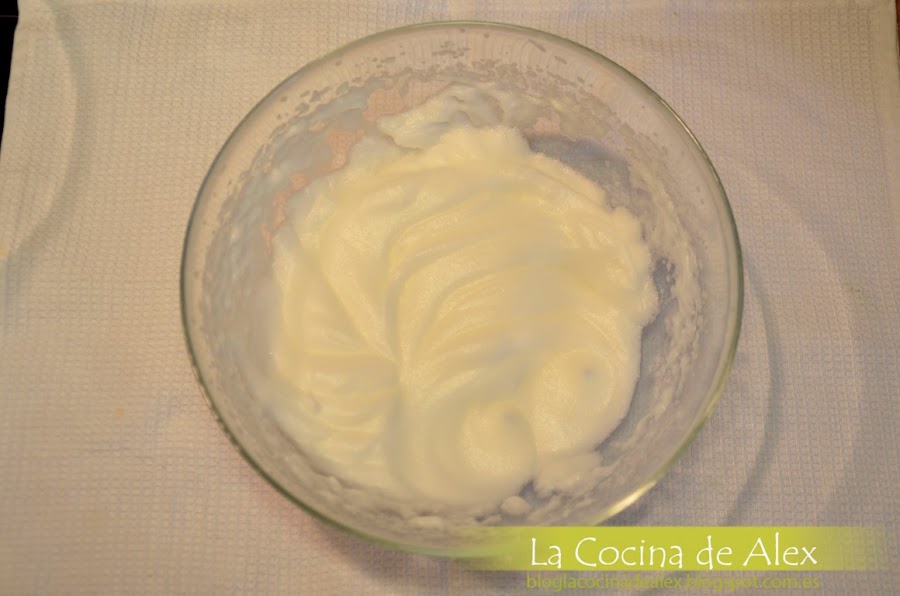 A continuación montamos las claras de los huevos a punto de nieve. Incorporamos las claras montadas a punto de nieve pero con movimientos envolventes y poco a poco para que no pierda volumen