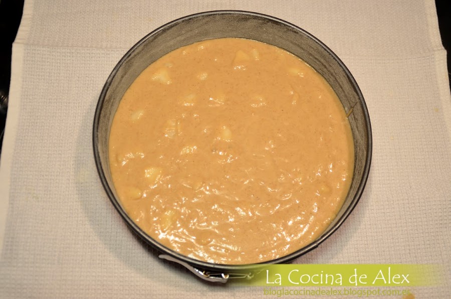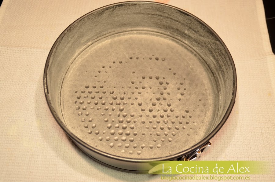 Por ultimo cogemos un molde desmontable redondo (23cms aprox.) lo untamos con mantequilla y lo enharinamos para evitar que la masa se pegue. Ponemos la masa y horneamos durante unos 40 minutos a 190º. Como siempre os digo, cada horno es distinto así que yo os recomiendo que a los 40 minutos lo pinchéis con un palillo de madera y sino sale limpio dejarlo unos minutos mas.