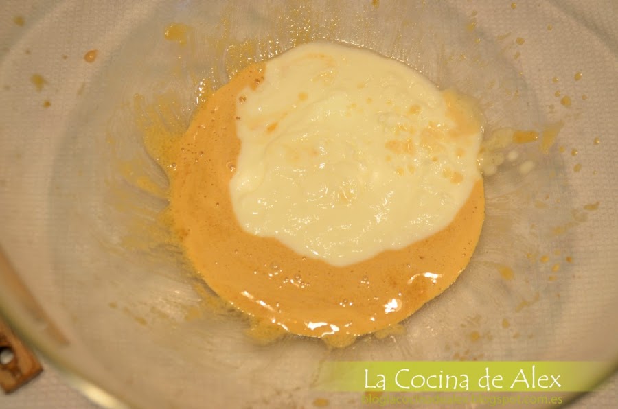 Añadimos el yogur y seguimos batiendo con las varillas. Derretimos la mantequilla en el microondas unos 15-20, reservamos.