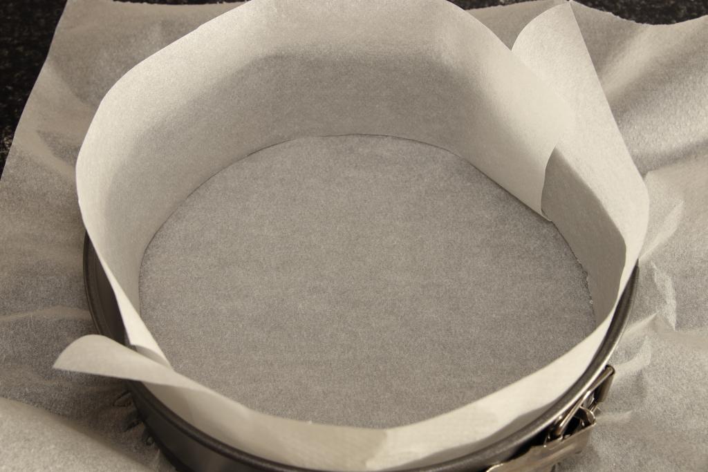 De la base.Escogemos un molde desmoldable de 22 cm, forramos la base y las paredes con papel de horno. Reservamos.