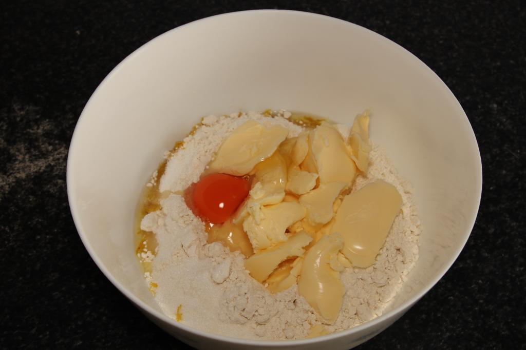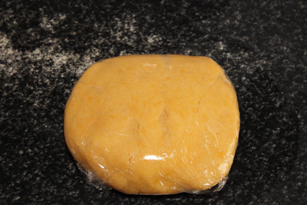 En un bol amplio mezclamos y amasamos todos los ingredientes. Si vemos que la masa nos queda seca, añadimos otro huevo (si no, no es necesario). No se necesita amasar demasiado, sólo hasta que la masa se una. Envolvemos en film tranparente y dejamos 15-20 minutos en la nevera. Resulta una masa pegajosa y quebradiza.