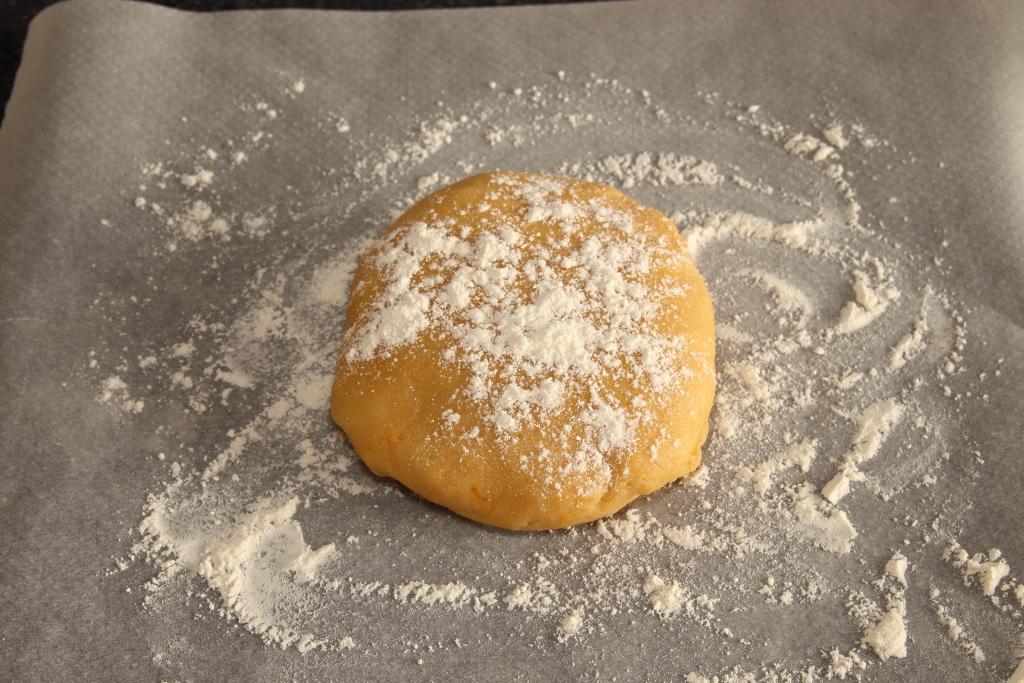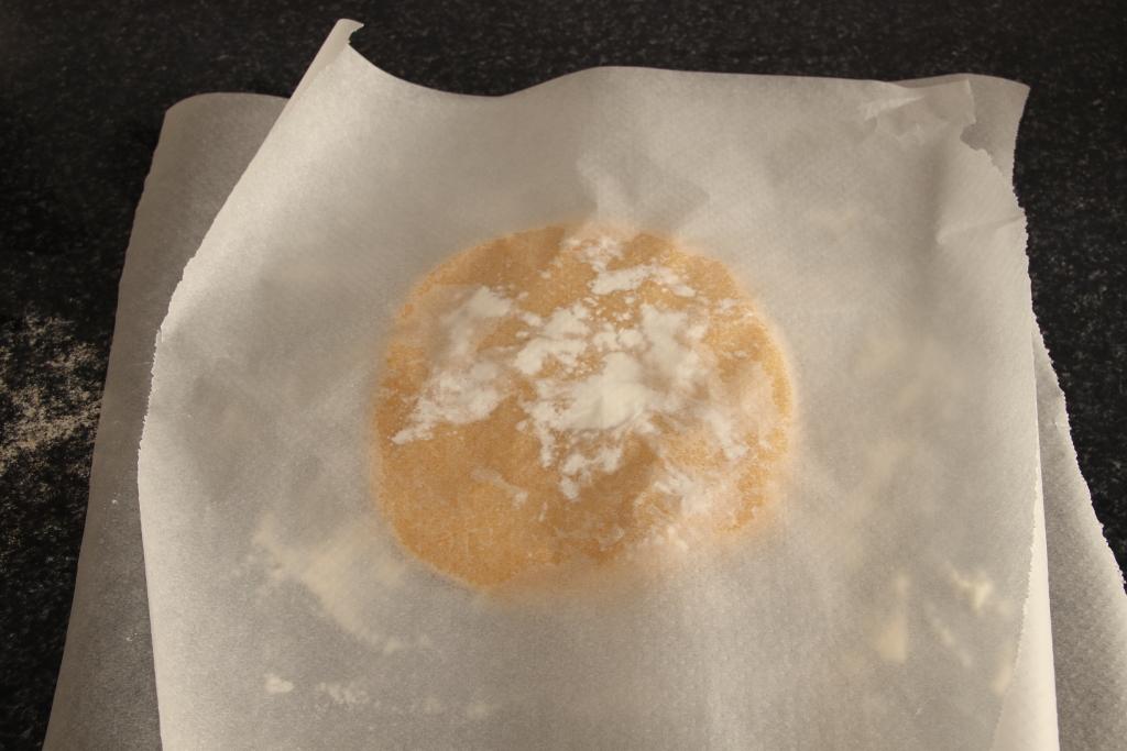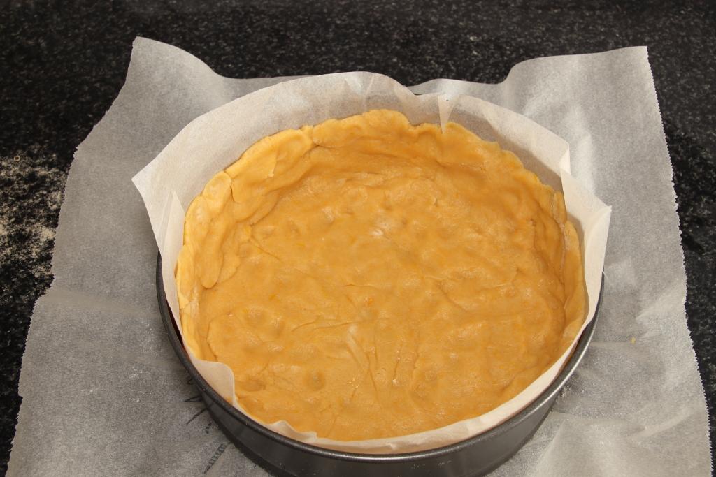 Espolvoreamos un poco de harina sobre la masa y la estiramos entre dos papeles de hornear con un rodillo a la medida de la base y parte de la pared del molde, no es necesario que la cubra por completo.