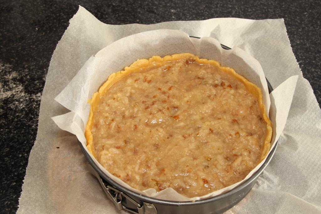 Lavamos bien las peras porque no las pelaremos. Las rallamos en un bol, añadimos la almendra molida, el azúcar y regamos con el licor, brandy… Mezclamos bien y vertemos sobre la base de nuestra tarta, repartimos bien. Dejamos reposar todo en la nevera unos 10 minutos.