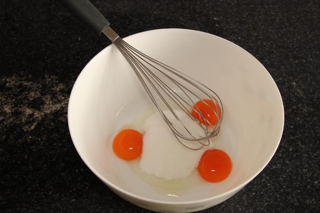 En otro bol mezclamos bien con una varilla manual las yemas de huevo, la sal y el azúcar. Integramos la mantequilla derretida en el microondas, mezclamos bien, que quede una crema suave.