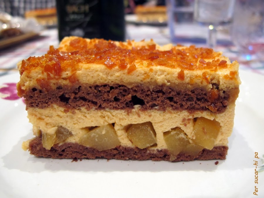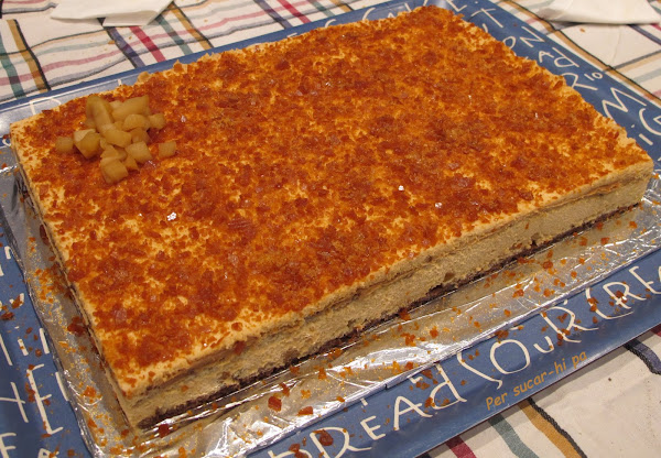 Cuando vayamos a servir, sacar de la nevera y espolvorear por encima el caramelo. En este caso reservamos también unos trozos de pera caramelizada para adornar una de las esquinas de la tarta.