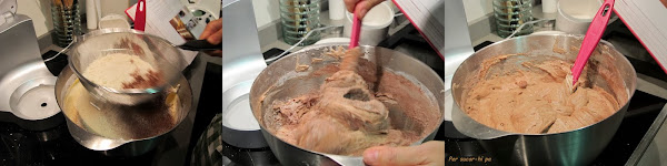 Incorporar las yemas y mezclar con movimientos suaves y envolventes. Añadir la harina y el cacao tamizados y mezclar bien hasta homogeneizar la masa.