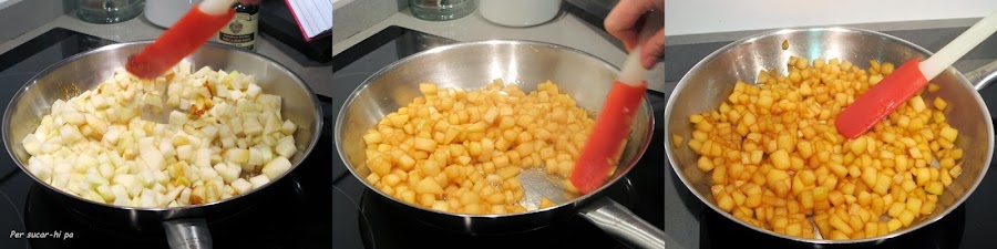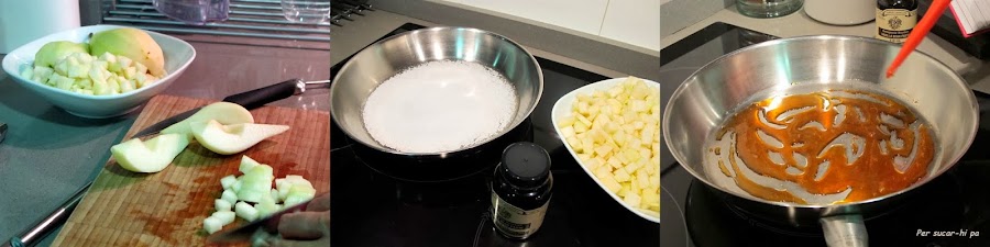 En un recipiente al fuego colocar el azúcar y hacer un caramelo oscuro, con cuidado de que no se queme. Añadir los dados de pera y la vainilla. Mezclar e ir removiendo durante unos 5 minutos. Retirar del fuego y reservar.
