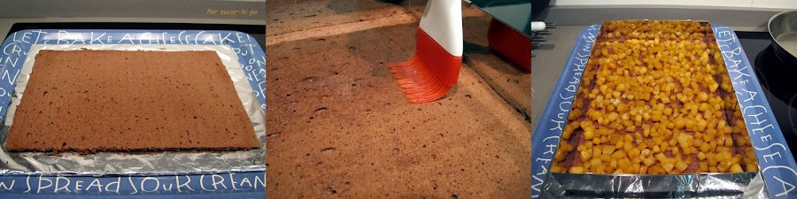 Colocar la segunda plancha de bizcocho y empaparlo en almíbar.