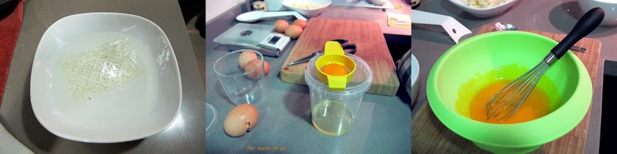 Mezclar las yemas con los 30 gramos de azúcar, sin blanquear.