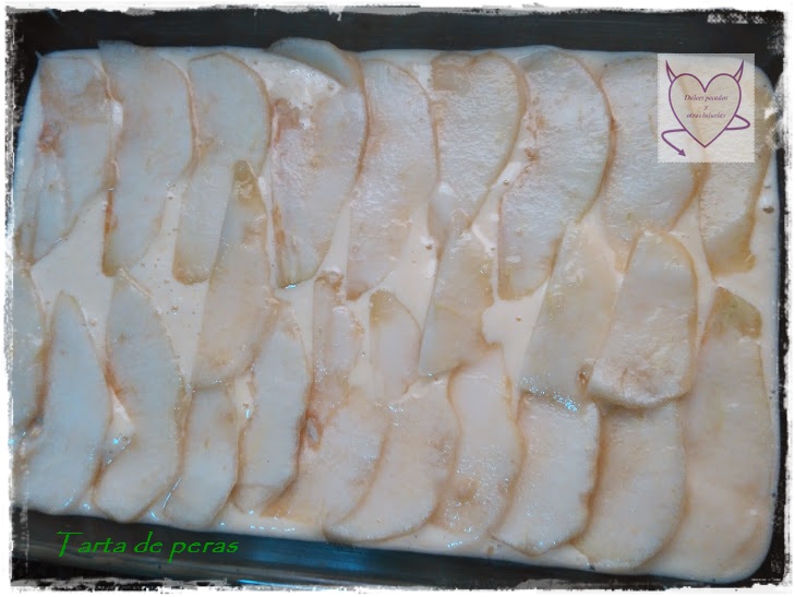Vertemos la mezcla obtenida en el molde y cubrimos con el resto de las peras peladas y cortadas en láminas cuidando de que no se hundan.