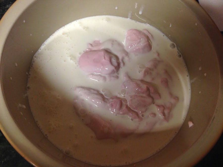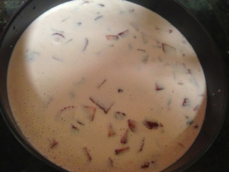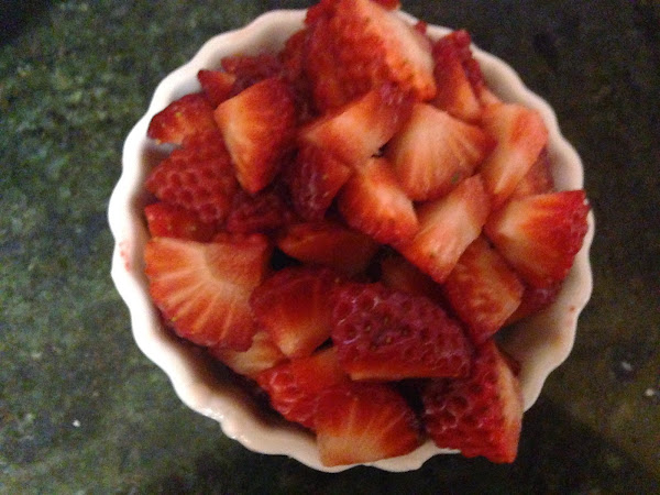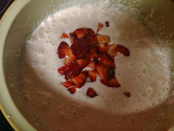 A continuación le añadimos el resto de la leche a temperatura ambiente, para que le leche con la gelatina se temple, removemosy lo echamos a la mezcla de petit suisse batiendo ligeramente. Añadiremos las fresas cortadas a trocitos que previamente las habremos preparado.