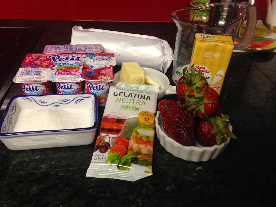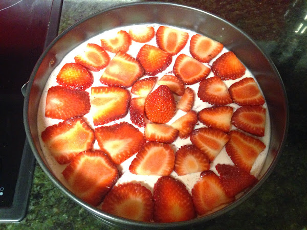 Volcamos la mezcla sobre la base de galleta, metemos en la nevera durante 4 horas como mínimo y decoraremos con fresas laminadas por encima.