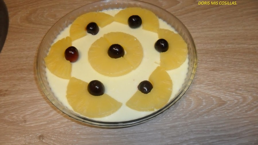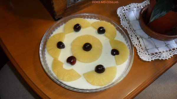 Es mejor preparar esta tarta el día anterior.En el momento de servir, pasamos un cuchillo con punta redondeada al rededor de la tarta, desmoldamos y adornamos al gusto.Yo la he adornado con rodajas de piña muy escurridas y guindas en almíbar.Servir bien fresquita..