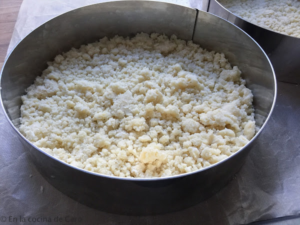 Colocamos el crumble, en un aro de 16cm de diámetro, que tendremos sobre una silpat cuidando que no nos quede muy grueso y tampoco lo aplastaremos demasiado.