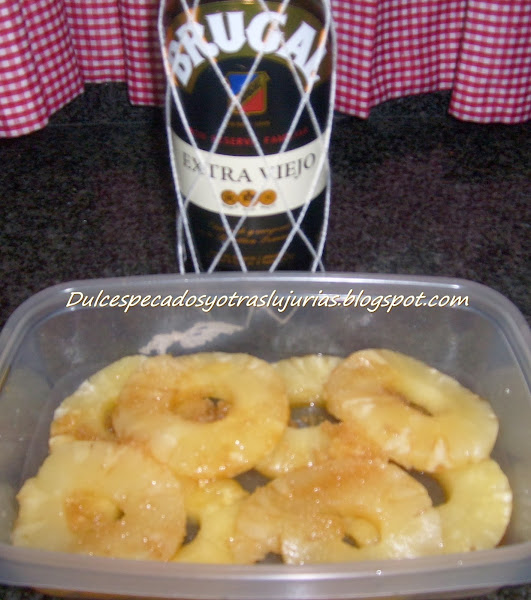 Para ello vamos a escurrir bien la piña intentando retirar todo el zumo que se pueda. Luego la ponemos en un bol y le añadimos las cucharadas de ron y las de azúcar moreno, dejándola macerar hasta que vayamos a usarla. Mejor si es toda la noche.