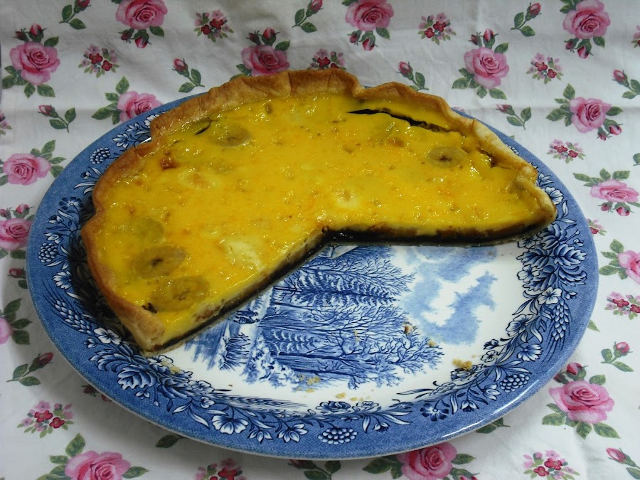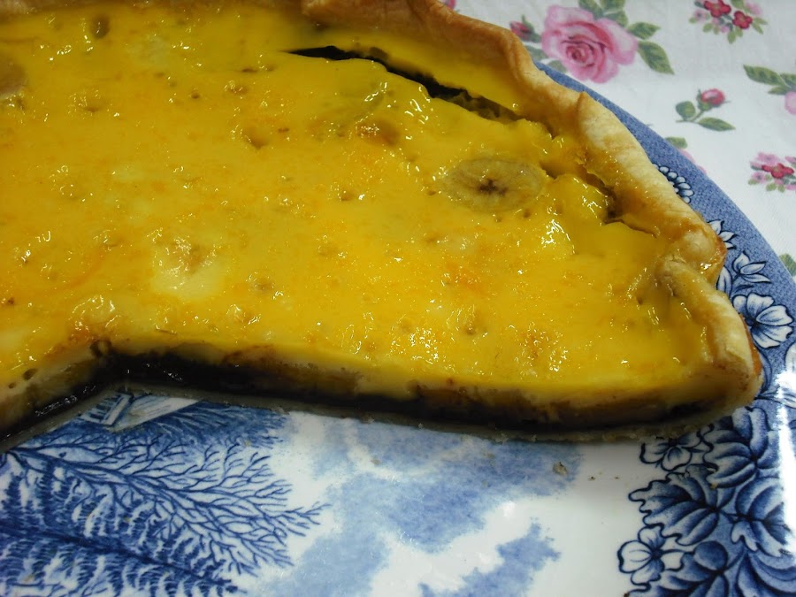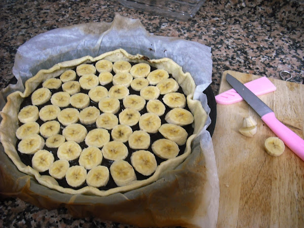 Cubrimos el chocolate con el plátano cortado en rodajas y luego con cuidado vertemos la mezcla de nata (crema de leche) y huevo sobre ellos.
