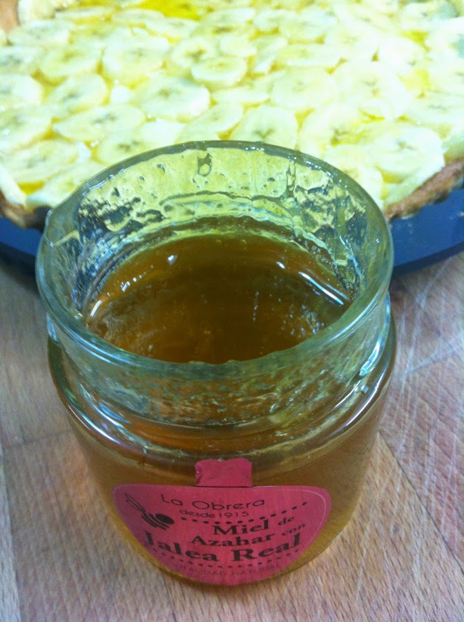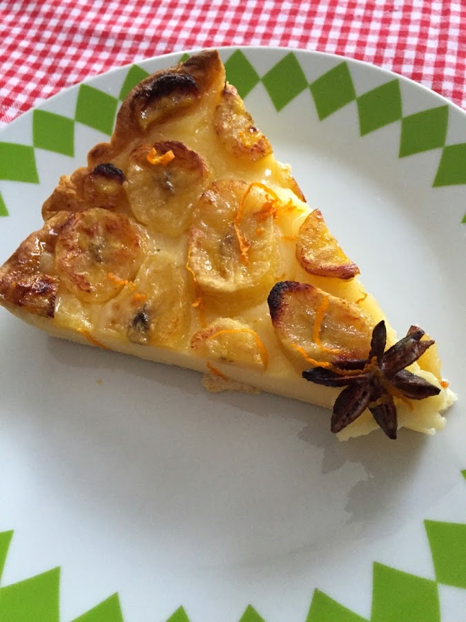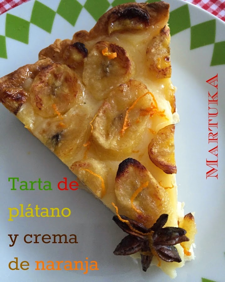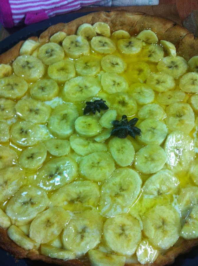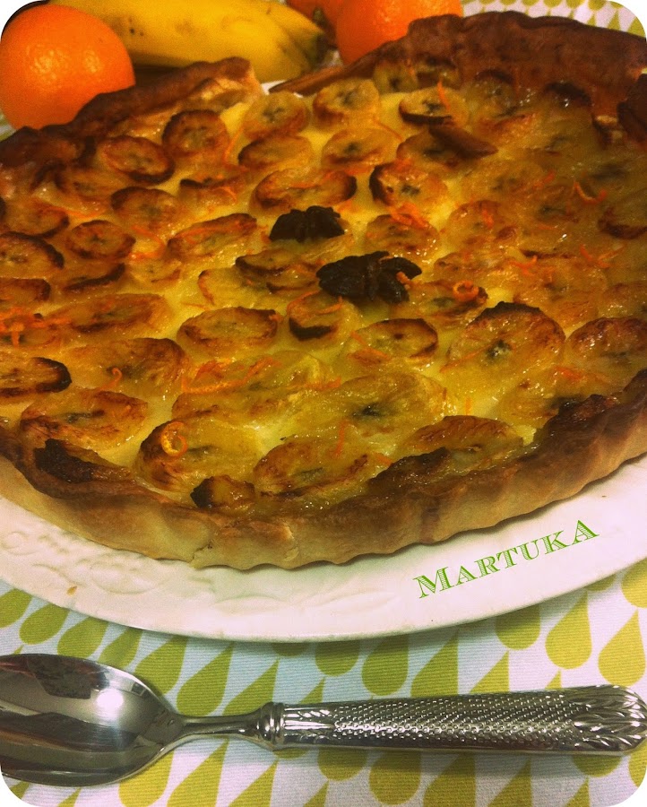 Se me ocurrió esta receta, partiendo de masa quebrada, con un relleno de crema con aroma a naranja, azahar y anís estrellado y cubierta con plátanos caramelizados con mantequilla y miel de azahar. ¿No os parece que la pinta es buenísima? Pues estaba muy rica, con un delicado sabor a naranja y a anís.Tengo también en este blog otra similar (en la que Nacho se basó) de pera y crema de vainilla, que me parece más jugosa y delicada (pincha aquí). Pero no se cumplen años todos los días, ni te dejan elegir el postre siempre... Felicidades, mi sol!!!