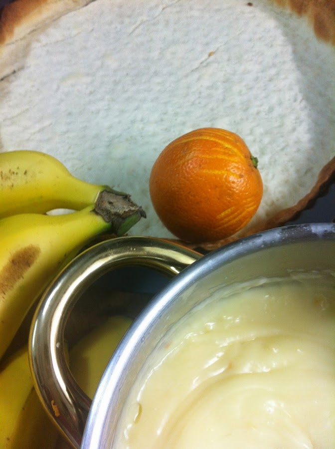 Mientras tanto se prepara la crema de naranja. Se pone en un cazo al fuego la leche, la nata (crema de leche), el azúcar, los anises, ralladura de naranja y agua de azahar. Se lleva a ebullición y se retira.