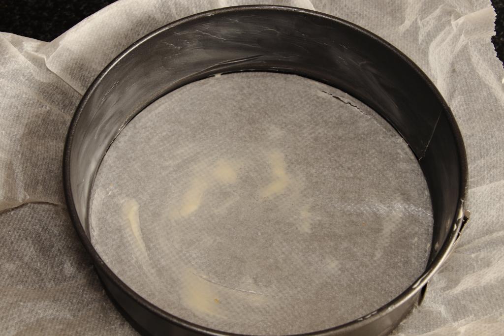 Escogemos un molde desmoldable de 22 cm de diámetro, forramos la base con papel de hornear, untamos fondo y laterales con mantequilla y reservamos.