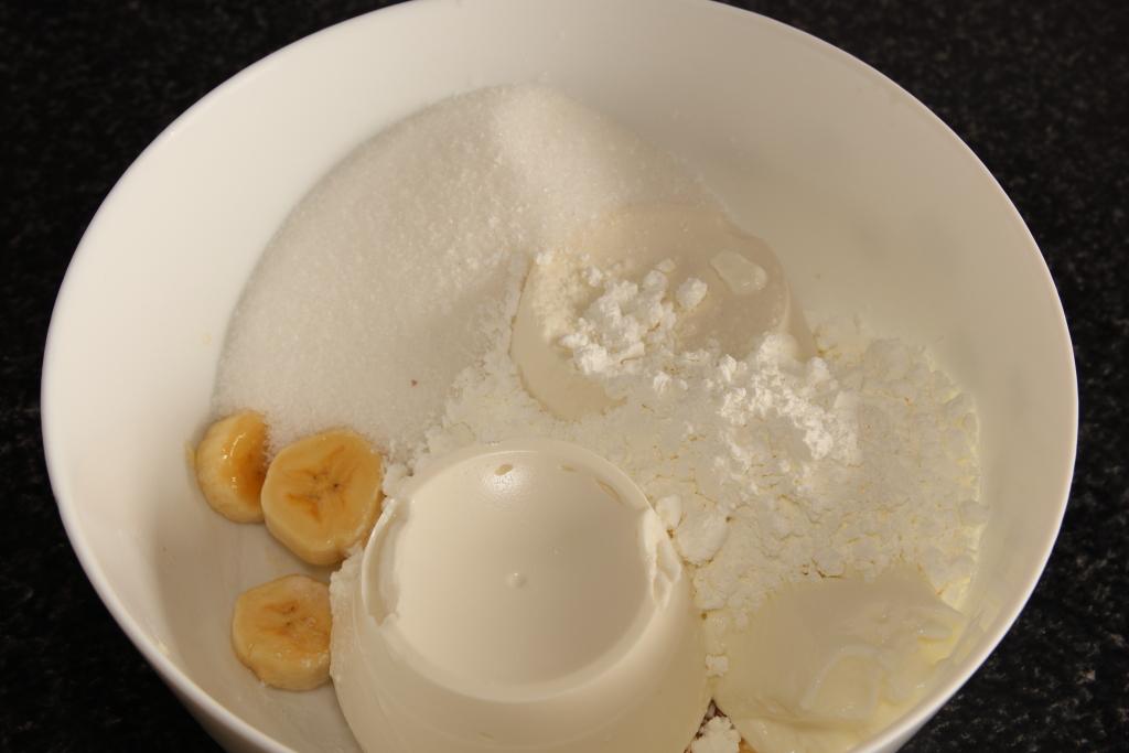 Pelamos 2 de los plátanos, retiramos bien las hebras troceamos, rociamos con el zumo del limón para que no se oxiden, colocamos en un bol amplio junto con las yemas de los huevos, el queso, el yogur, el azúcar y la Maicena. Trituramos todo hasta obtener una crema homogénea. Reservamos.