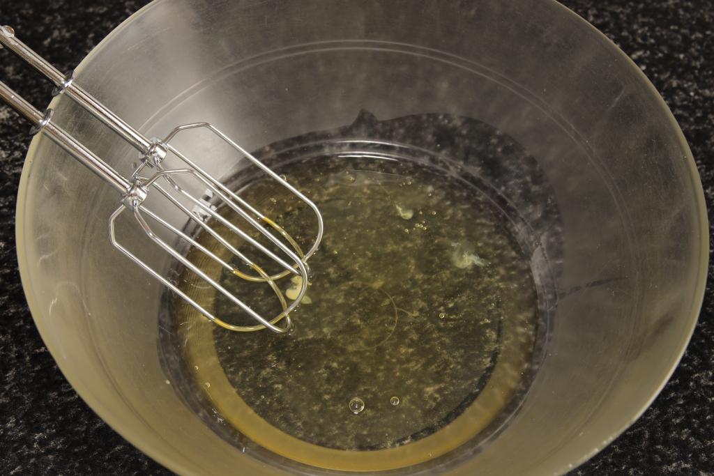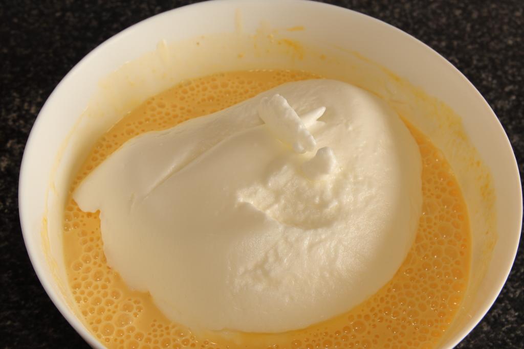En otro bol amplio batimos las claras a punto de nieve con unas varillas eléctricas y las incorporamos suavemente y con movimientos envolventes a la crema anterior, debe quedar una crema homogénea y sin grumos. Precalentamos el horno a 180ºC, calor arriba y abajo.