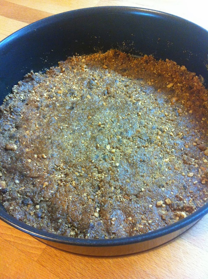 Se ponen en el fondo de un molde desmontable y se añade la mantequilla derretida, trabajando con los dedos hasta que quede una masa uniforme, que apretamos contra el fondo del molde.