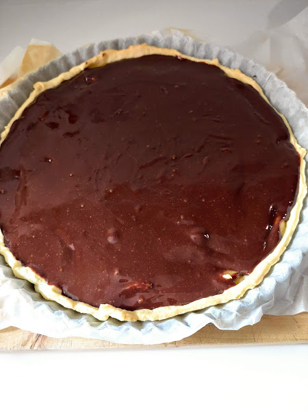 Preparamos el relleno. Derretimos el chocolate al baño María y reservamos. Hervimos la nata (crema de leche) y la vertemos sobre el chocolate poco a poco, revolviendo constantemente, hasta obtener una crema sin grumos. En un bol, batimos ligeramente el huevo entero, la yema y el azúcar y luego añadimos progresivamente la mezcla de nata (crema de leche) y chocolate.