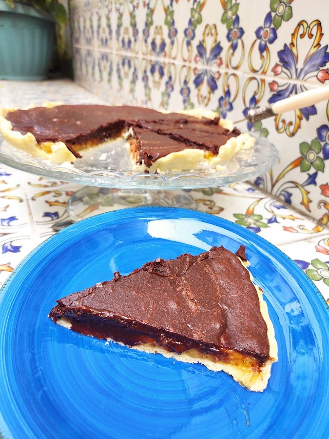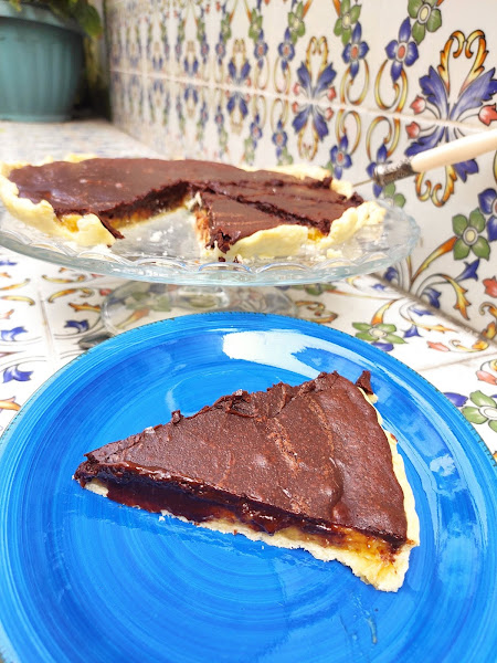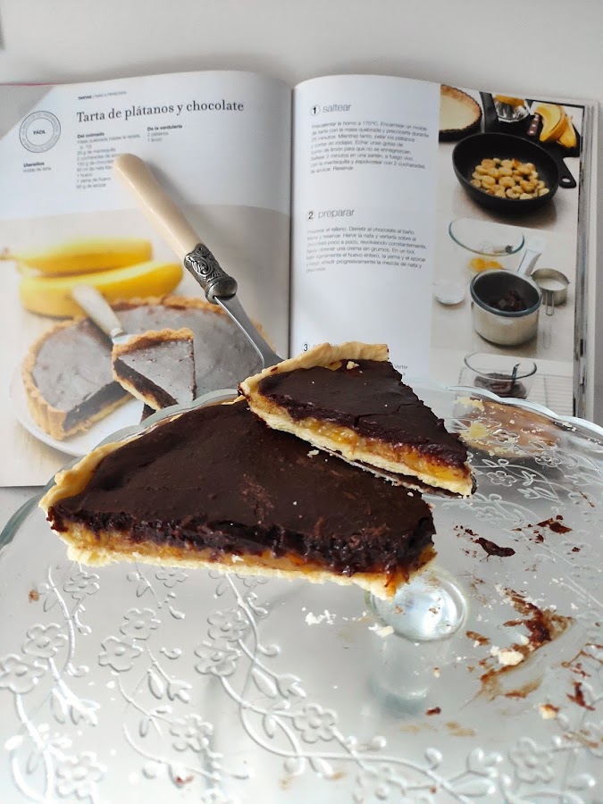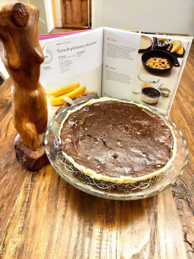Colocamos los plátanos encima de la masa. Vertemos la mezcla de chocolate. Horneamos 20 minutos a 150º. Servimos la tarta templada o fría. Se puede conservar perfectamente hasta el día siguiente.