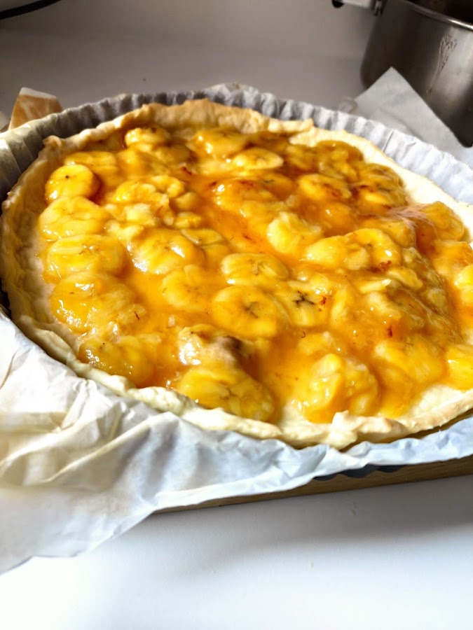 Precalentamos el horno a 170º. Encamisamos un molde de tarta con la masa brisa y la precocemos durante 25 minutos. Mientras tanto, pelamos los plátanos y los cortamos en rodajas. Echamos unas gotas de zumo de limón para que no se ennegrezcan. Saltemaos 2 minutos en una sartén, a fuego vivo, con la mantequilla y espolvoreamos con 2 cucharadas de azúcar. Reservamos.