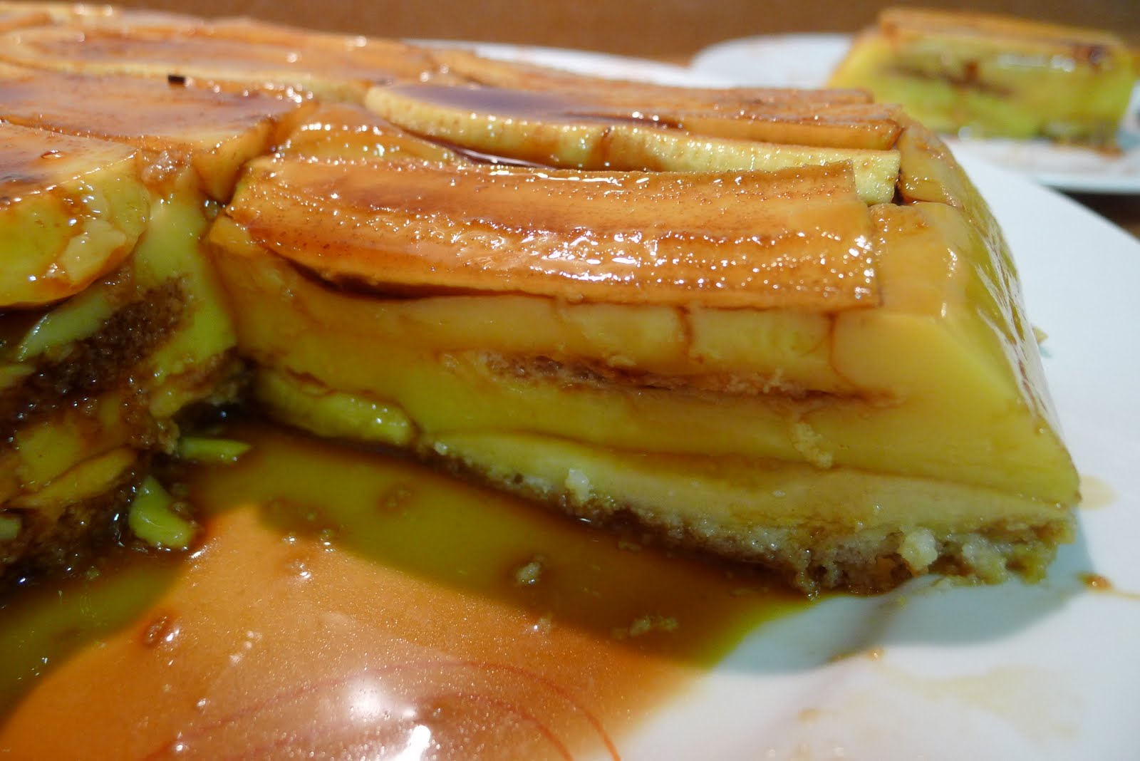 Ahora ya podemos empezar a montar la tarta,primero colocaremos una capa de platanos,(que quede bonita porque es la que se va a ver arriba),encima otra de flan que cubra los platanos bien y otra de sobaitos,en mi caso los he partido por la mitad,haciendolos asi mas finitos,luego yo he seguido con otra de flan de nuevo(para que se empaparan los sobaos y no quedaran secos),platanos y para terminar ultima capa de sobaitos remojados en leche caliente con un chorritin de ron con miel,le dio un gusto buenisimo.