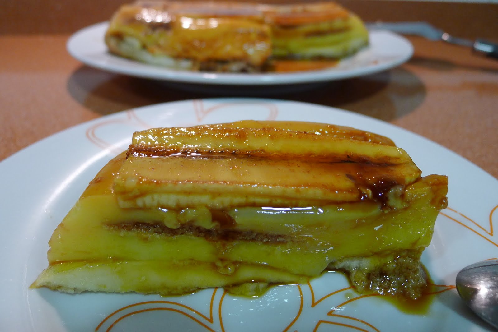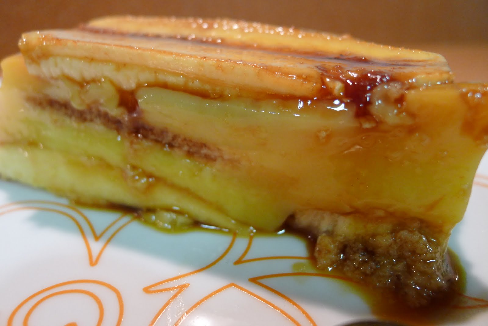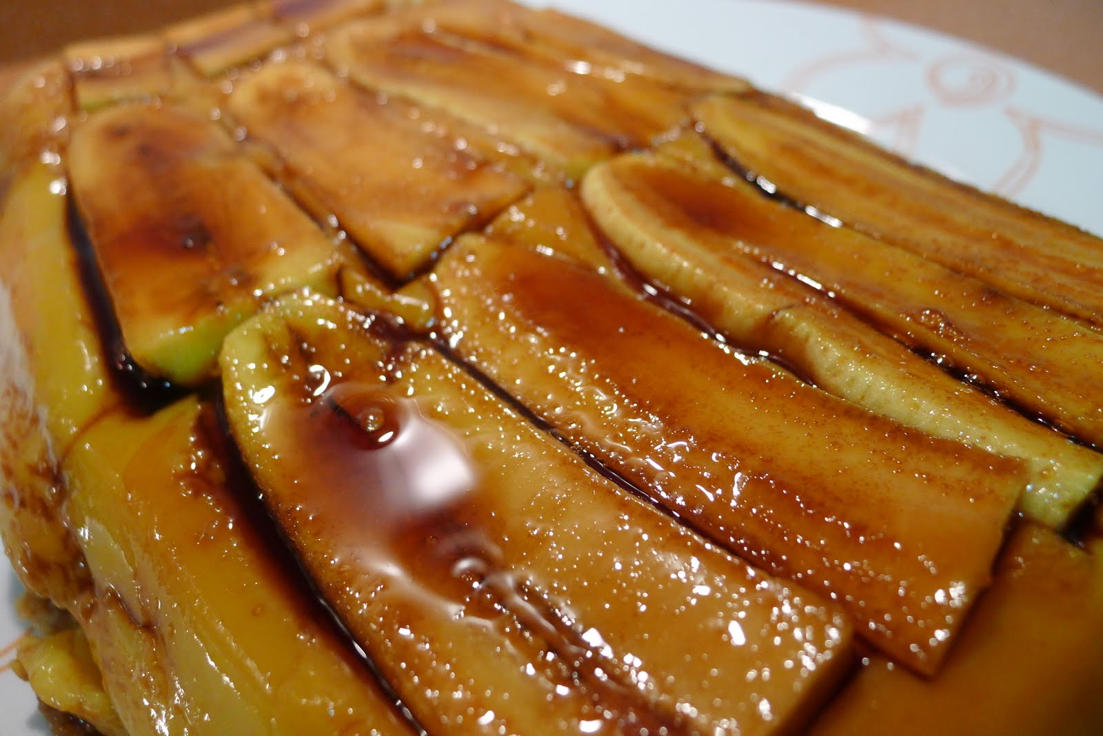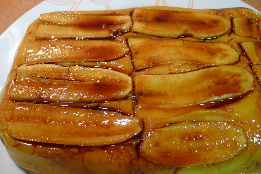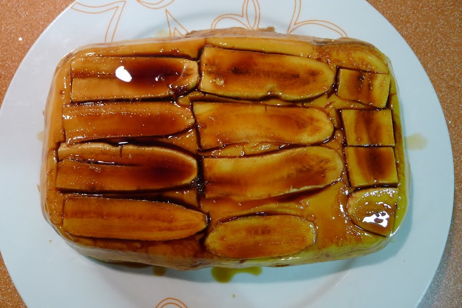 Comenzamos untando con caramelo liquido una fuente un poco alta,en mi caso utilice una rectangular de cristal.Pelamos los platanos y los cortamos a laminas a lo largo,reservamos.