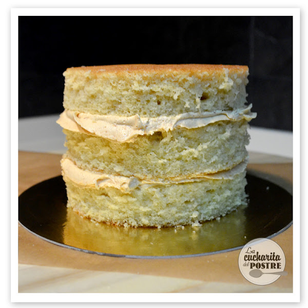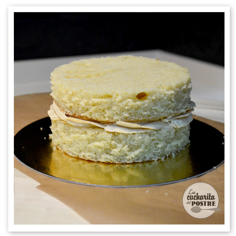 3. Pon el siguiente bizcocho encima y ejerce un poco de presión para que se asiente bien. Ten especial cuidado para que quede bien centrado. Así evitarás que la tarta se quede como la Torre de Pisa.