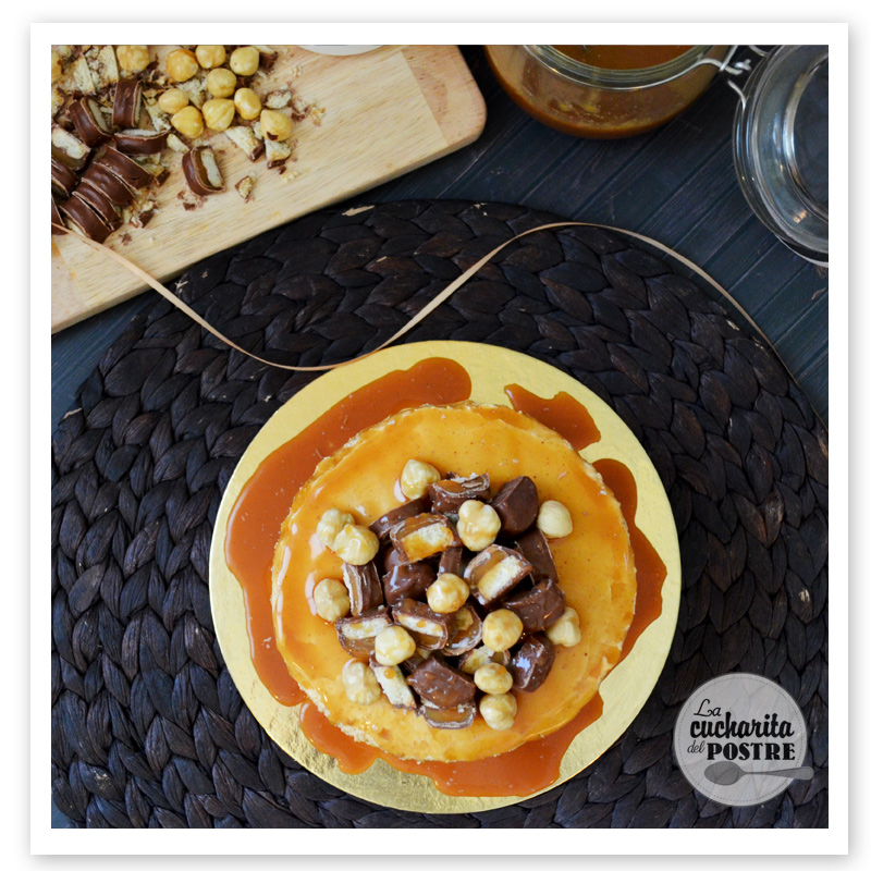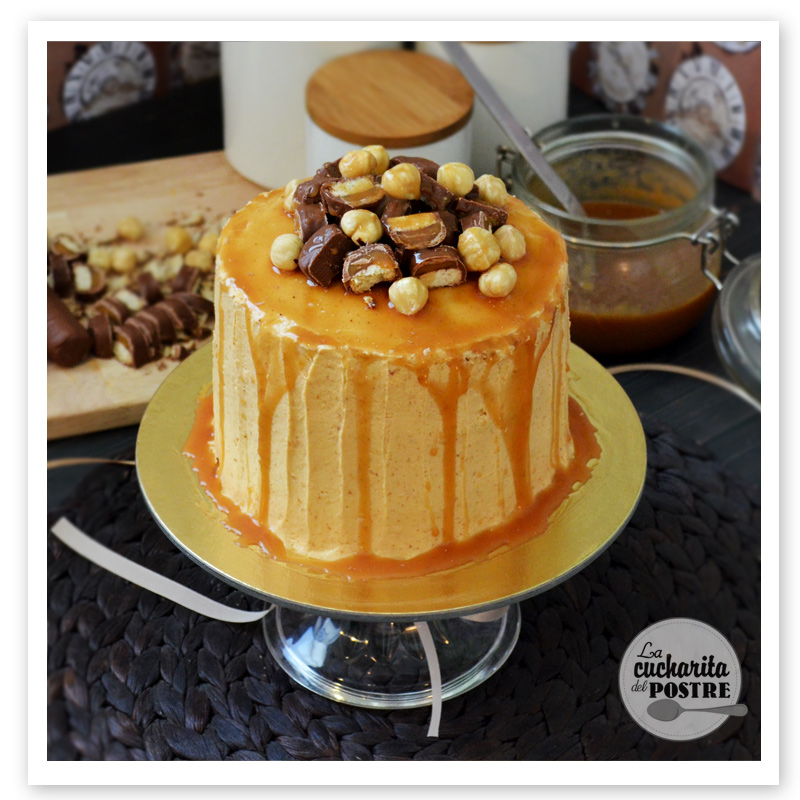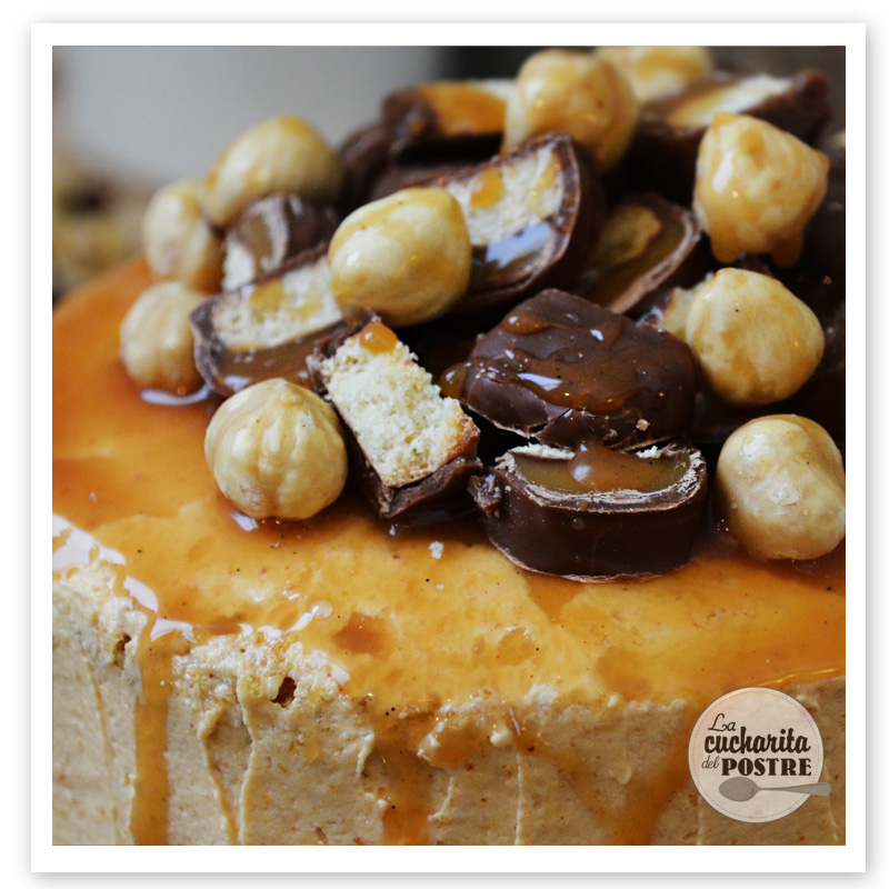10. Para terminar, añade en el centro de la tarta unos trocitos de barritas de chocolate (tipo Twix) y unas avellanas para crear contraste de colores, texturas y sabores.
