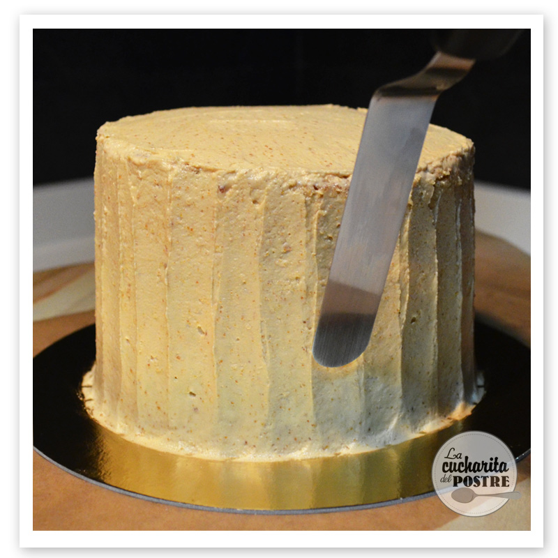 8. Por último, cubre nuevamente la tarta con una capa un poco más gruesa de crema y déjala lo más lisa posible, sobre todo por la parte superior. Usando una espátula pequeña, haz pequeños surcos por todo el lateral desde la parte de abajo hacia arriba para dejar un acabado como éste: