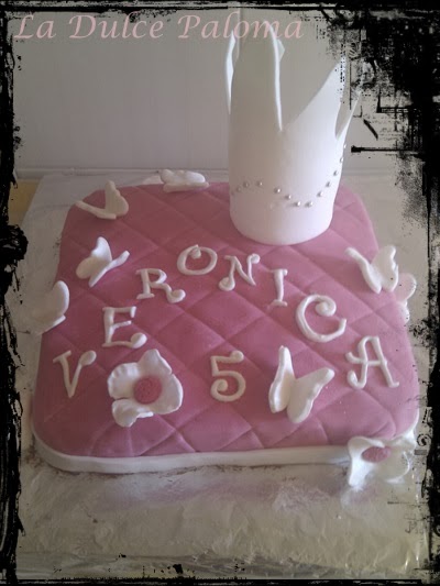 Por supuesto la corona de princesa. La corona fue mi gran comedero de cabeza... no la veía, no sé demasiado alta, desproporcionada... pero luego puesta no quedaba nada mal. Muy muy sencilla, ya que el resto de la tarta llevaba los detalles. Pero la corona nos indicaba que la tarta era para una princesita.