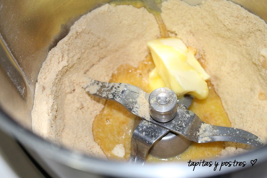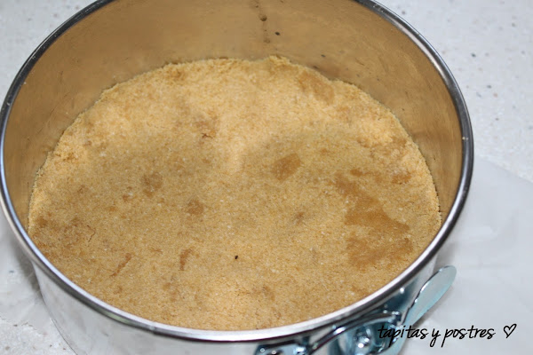 Añadimos la mantequilla blanda y mezclamos 20 segundos a velocidad 4. Vertemos esta masa en el fondo de un molde desmoldable de unos 20 cm y aplastamos bien. Dejamos enfriar en la nevera o en el congelador mientras preparamos la crema.
