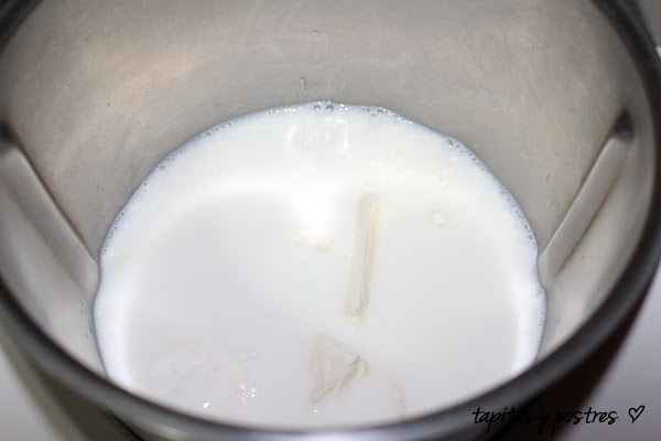 Para la crema ponemos todos los ingredientes (menos los dos sobres de cuajada) en el vaso de thermomix y calentamos 7 minutos a 90º y velocidad 4.