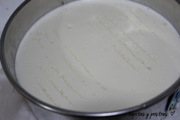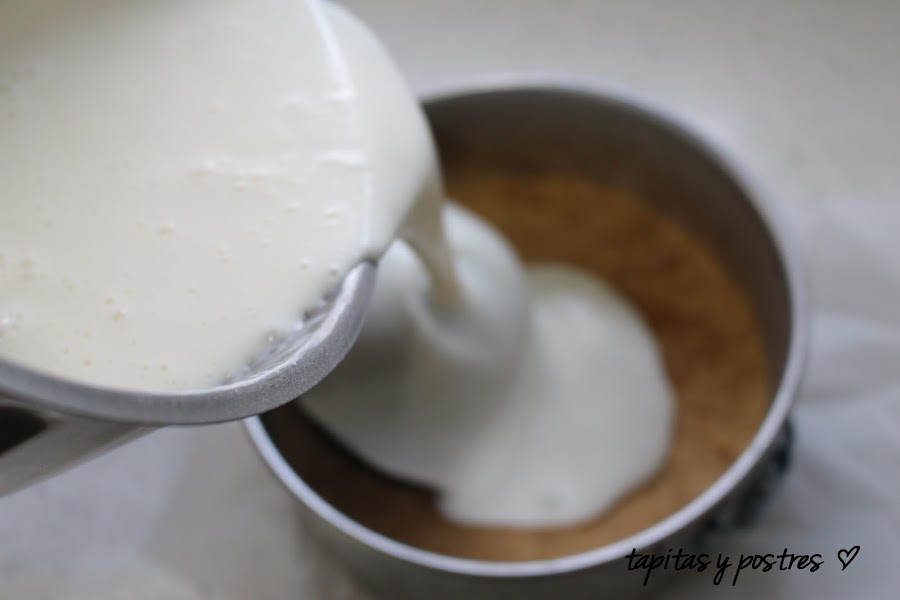 Vertemos la mezcla sobre la base de galletas y dejamos enfriar.