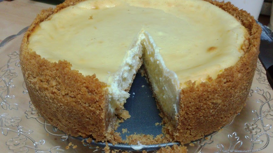 Vertemos esta mezcla en el molde que tenemos en el frigo forrado de galleta y metemos al horno. Horneamos durante 1 hora o hasta que esté firme. Apagamos el horno y dejamos enfríar con la puerta del horno entreabierta.